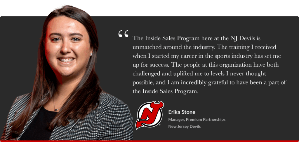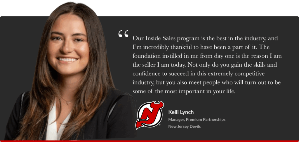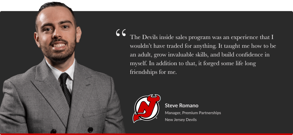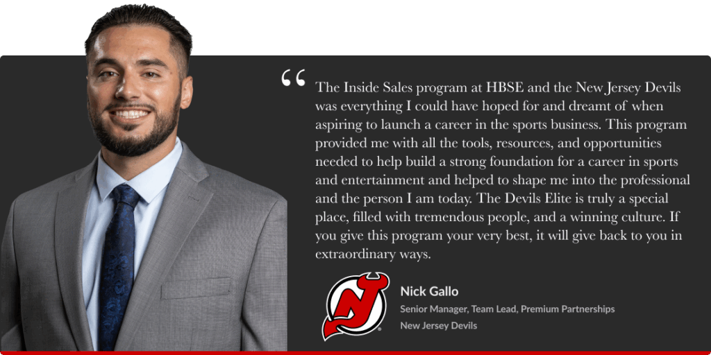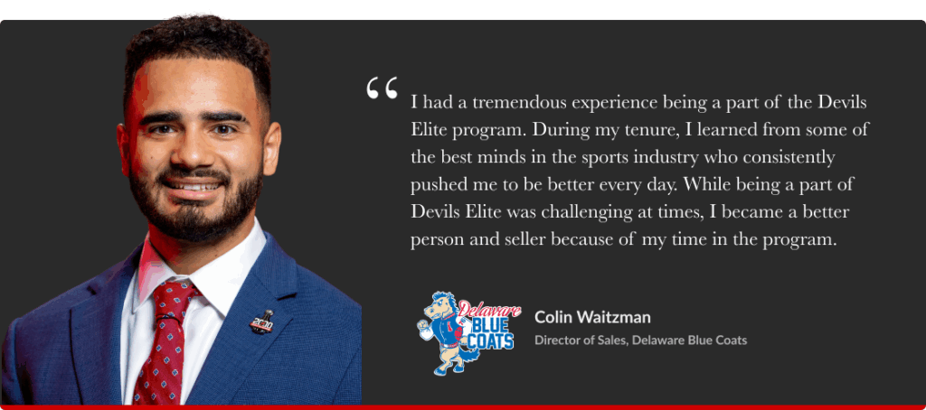 The entry level sales program of the New Jersey Devils is renowned for being a world-class training and development program in the realm of professional sports. By emphasizing training, career growth, and fostering a culture of competitiveness, inclusivity, and mentorship, Devils Elite has a track record of launching recruits toward becoming prominent figures in the sports industry. Devils Elite is an exceptional starting point for those aspiring to pursue a career as a sports business executive, offering unparalleled opportunities for growth and development.
